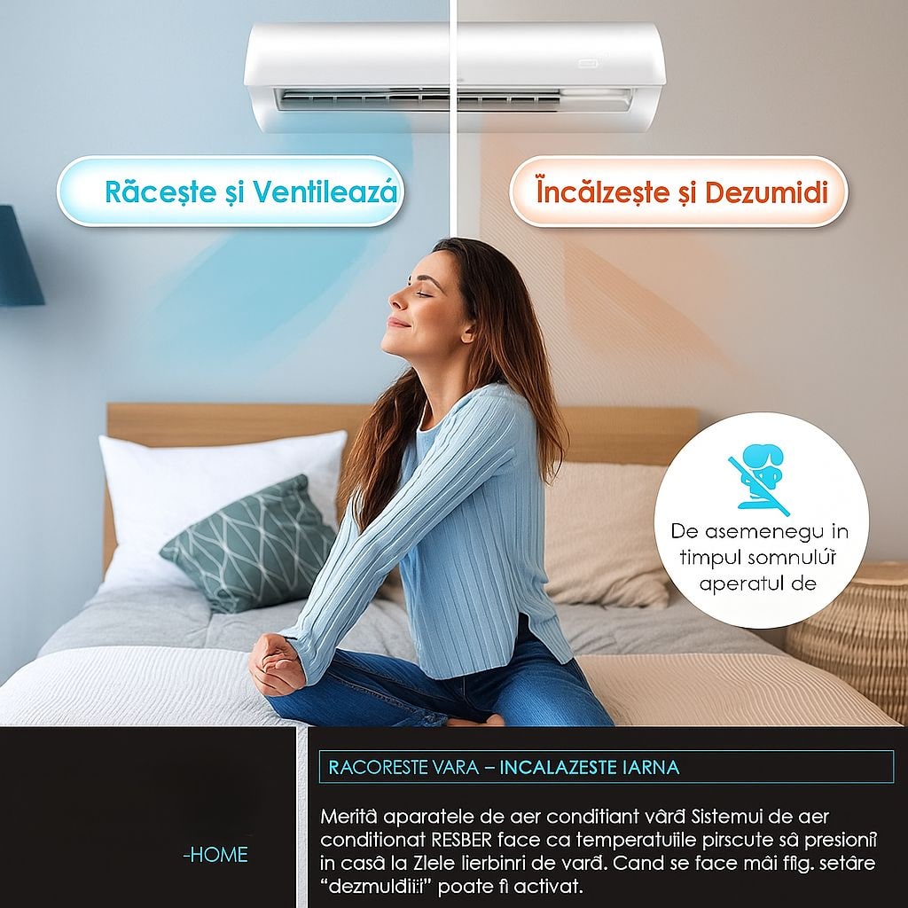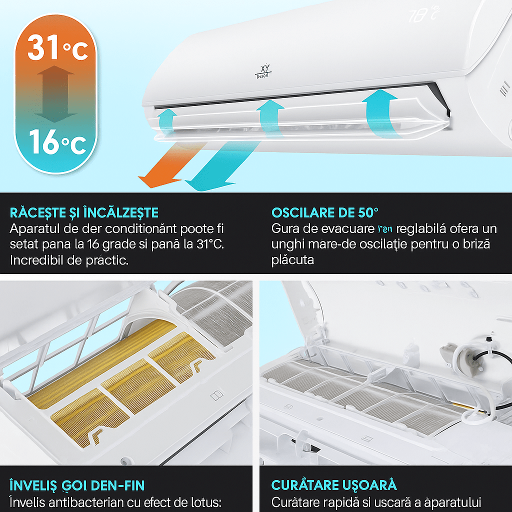 Cu telecomanda inclusă, puteți gestiona și schimba programele între încălzire, aer cald, încălzire rapidă, aer rece și dezumidificare. De asemenea, puteți seta temporizatoare de oprire automată și un program zilnic și săptămânal ideal pentru mediul dumneavoastră.